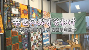 主婦がSNSで偶然に知り合ったナイジェリア人。竹箸をおすそわけしたら、9か月後、お礼にアフリカ布が送られてきた。懐かしさを感じて調べてみたら、日本が以前、経済援助で絞り模様を伝えていたのだった。やがて主婦はSNSでアフリカ布を販売し、展示会やコンサートを開くに至る。稀有な物語だが、実話だ。